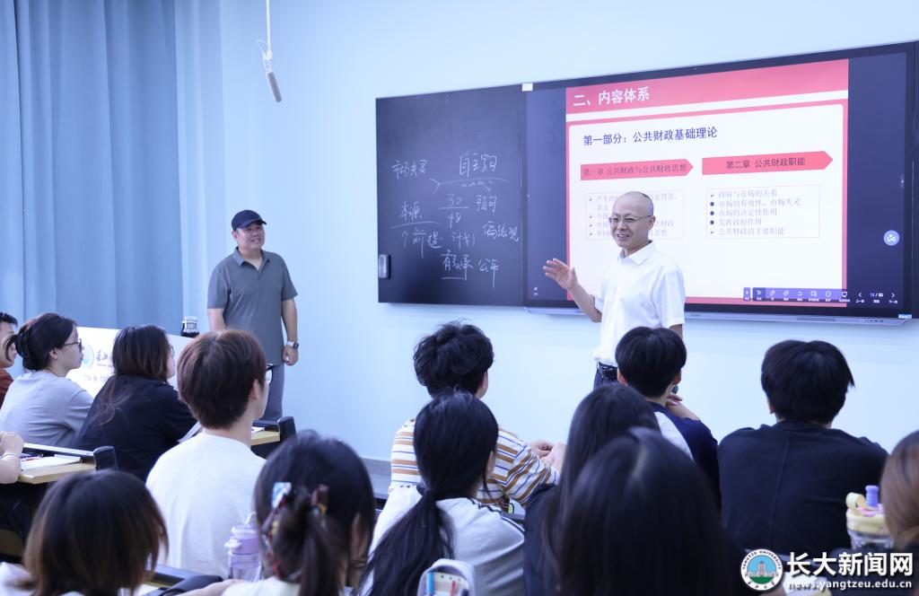 同一时间,经济与管理学院涂奔老师的《财政学》课堂也迎来了刘勇胜校长。刘勇胜细致聆听,频频点头,课后与师生就专业问题展开了讨论。