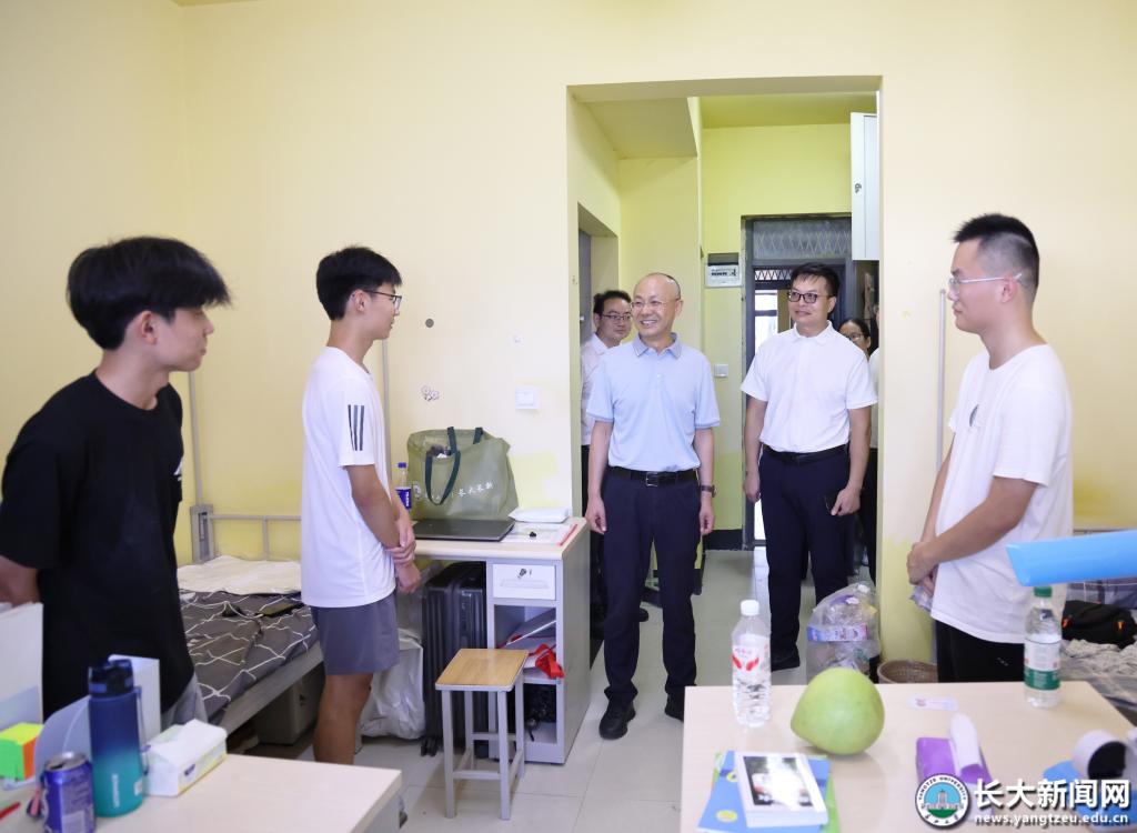 检查完迎新点后,刘勇胜来到东校区22栋和25栋学生宿舍,为刚刚入住“新家”的同学们送去暖心问候。在22栋A524、A526等宿舍,刘勇胜与新生及家长拉起家常,细致询问新生入学适应情况,勉励同学们站在新的起点好好学习,尽早融入大学新生活。