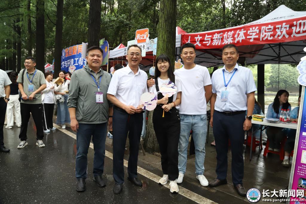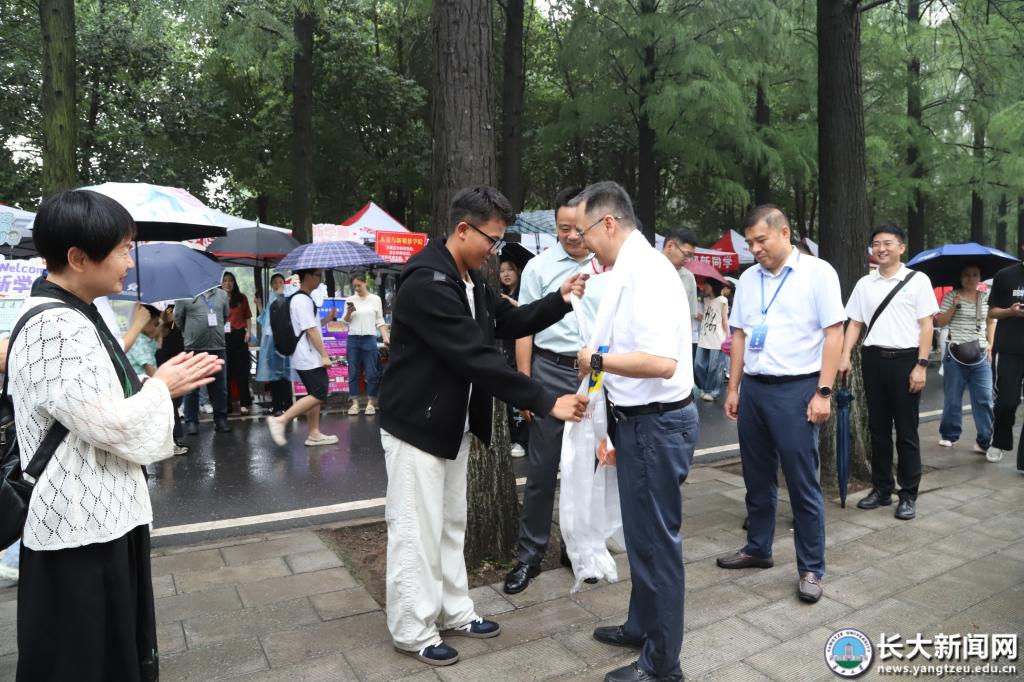 在计算机科学学院迎新点前,来自西藏的新生旦增尼玛,为王建平送上哈达,表达了美好祝福;人文与新媒体学院新生粘思嘉,则将刚刚在迎新点亲手制作的漆扇赠予了王建平。王建平与他们亲切交流,欢迎他们来到永利yl23411集团官网入口这个大家庭。