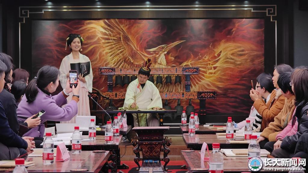 在随后的“优孟衣冠”中,人文与新媒体学院、教育与体育学院和图书馆的老师们带来别样的情景短剧《一代才女谢道韫》,展现了一位才气过人、文武双全的女性形象。老师们纷纷拿出手机记录,用热烈的掌声向带来精彩表演的演员致敬。