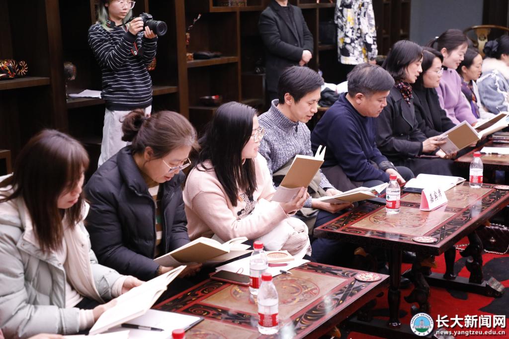 “诗海泛舟心自悠,书林漫步韵长流”“诗词歌赋传佳话,墨香四溢映晚霞”“烽火连三月,家书抵万金”……在“诗书自华”互动游戏中,老师们积极吟诗,各显风采,分享自己或自创或积累的诗句。为了更深刻地领会诗词的美学,在场人员还在杨名的带领下集体吟诵了李清照的名篇《一剪梅·红藕香残玉簟秋》,以饱满的情感传递着古典诗词的魅力。